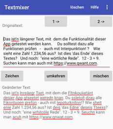 Dann kann der Textmixer tätig werden und diesen Text abändern, unter Beibehaltung der von dir eingegebenen Buchstaben und Zeichen. Der geänderte Text kann in den Wörtern die Buchstaben gemischt aufweisen. Oder die Wörter sind von hinten nach vorne notiert, also in umgekehrter Reihenfolge. Die einzelnen Möglichkeiten der Veränderungen findest du weiter unten beschrieben.